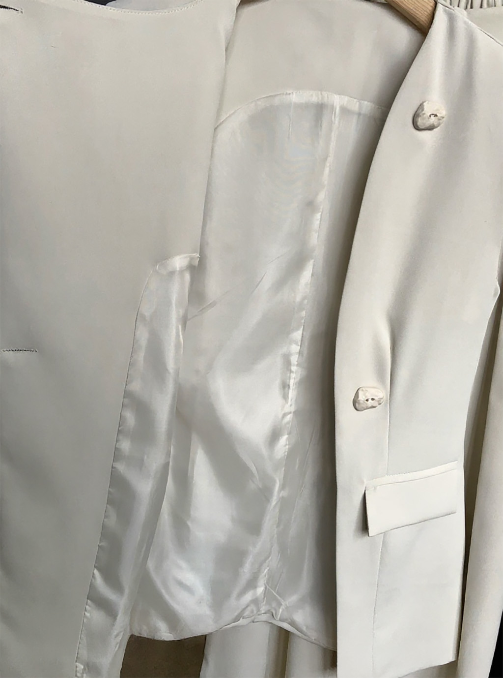 유니크한 단추와 비대칭 클로징 디테일이 포인트예요.
